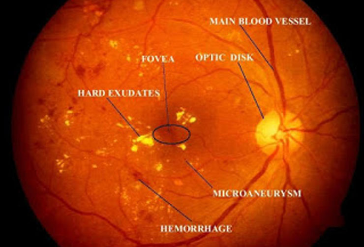 Diabetic retinopathy is caused by damage to the blood vessels in the tissue at the back of the eye (retina). Poorly controlled blood sugar is a risk factor. Early symptoms include floaters, blurriness, dark areas of vision and difficulty perceiving colours. Blindness can occur.
